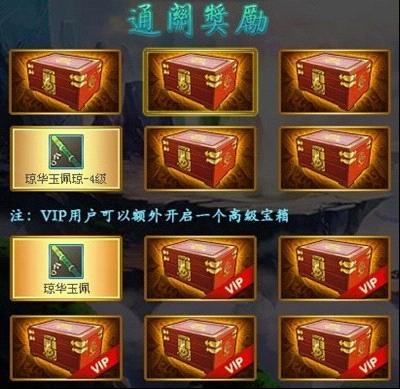 当杀掉最后一关的BOSS之后,会弹出翻宝箱界面,玩家可随意翻取一个箱子,领取自己的奖品,普通用户能翻一张牌,VIP用户可以多开启一张,如果倒数时间内不选择箱子,系统将默认帮您选择第一个箱子。