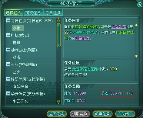 二、玩家达到26的时候可以找仙起镇-镇口-祝融使者接每日任务,每日任务可以获得比较多的经验、绑定金和灵石。而作为陪游仙侠风云硬性货币的灵石,一向都是有价无市的,如果拥有VIP可以获得1.2倍的灵石奖励,快速积累你所需要的灵石。